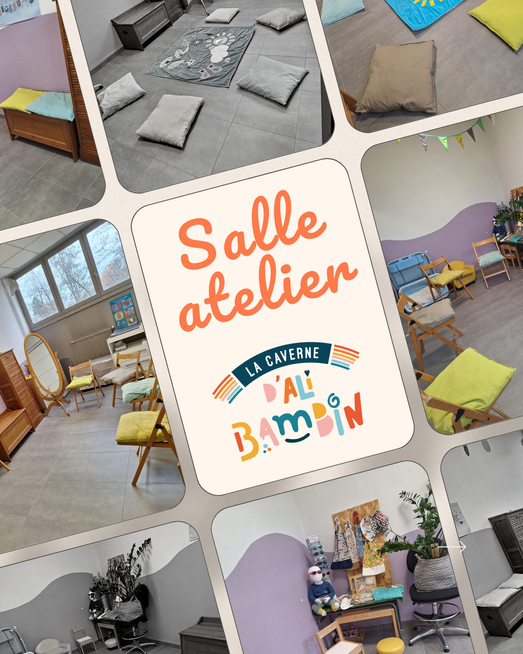 La salle est modulable (chaises, coussins, tapis…) et peut accueillir confortablement :